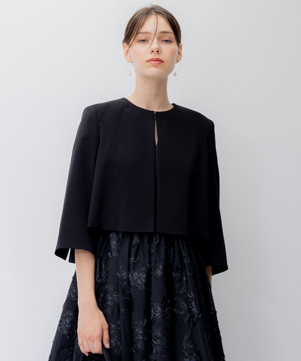 下画像は、かっちりしすぎないジャケットシルエットで合わせやすい「Pour Vous(プール・ヴー)」ショールカラーボレロジャケットです。上画像のパンツドレスとコーディネートしていただけます。