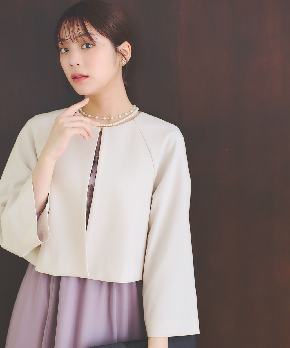 下画像は、ボレロ感覚で軽く羽織れる「any SiS」【洗える】セレモニークロップド ジャケットです。上画像で紹介させて頂いたドレスに合わせて頂くと、きちんと感がアップしますのでお勧めです。