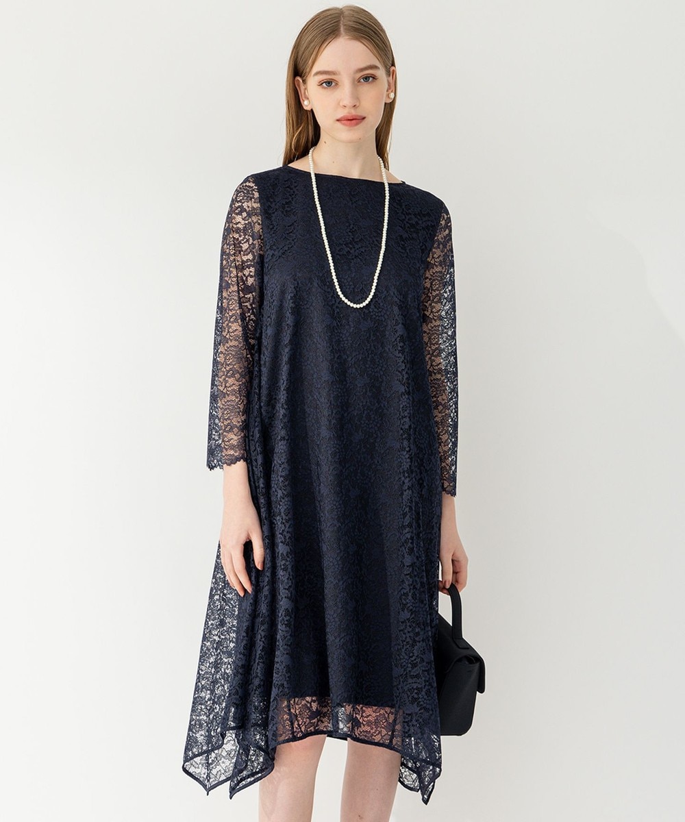 下画像は、繊細なレースの風合いとイレギュラーヘムが印象的な「23区」【APPLAUDIR(アプロディール)】【APPLAUDIR】デリカレース ドレスです。ドレス丈38/Mサイズ相当で104.1㎝です。