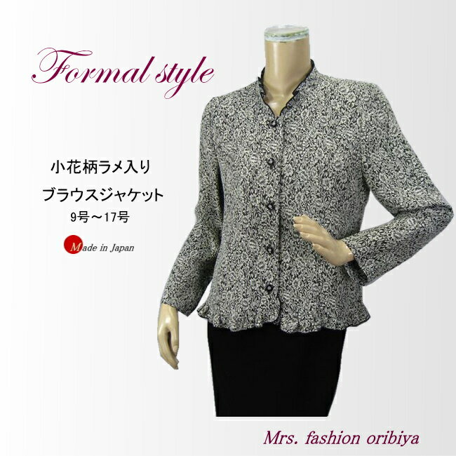 下画像は、上品な華やぎを添える「ミセスファッション 織美屋」モノトーン小花柄ラメ入りフリルカラーシニアフォーマルブラウスジャケット〈9~17号〉です。![]()
