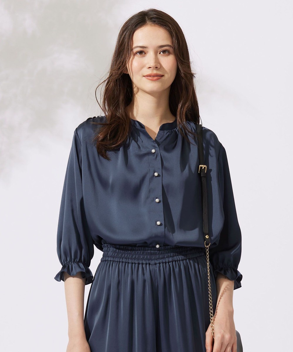 下画像は、程よい光沢とパール釦が女性らしい「自由区」【WEB&一部店舗限定・セットアップ対応・洗える】セミブライトサテン ブラウスです。