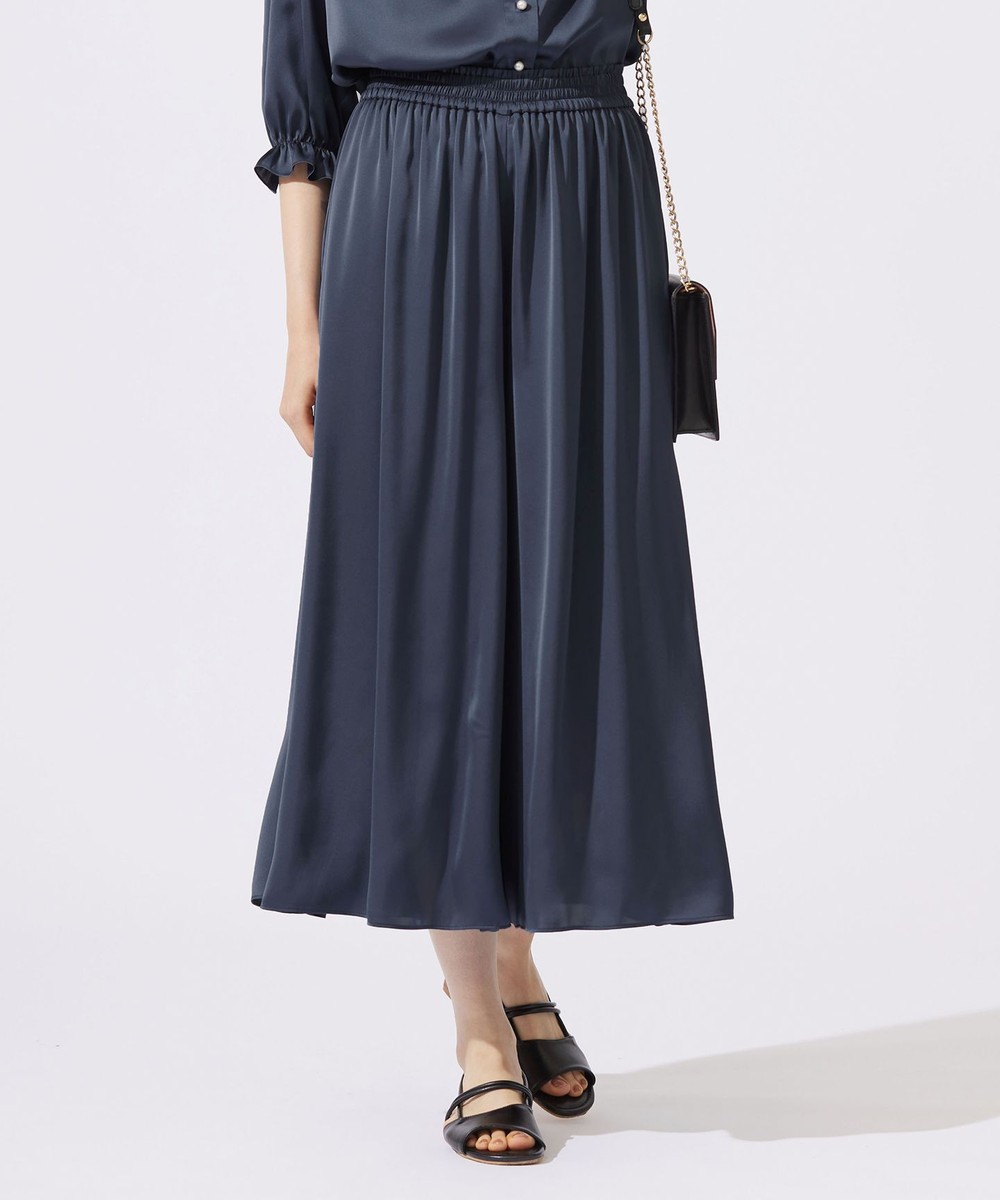 下画像は、スカート見えする「自由区」【セットアップ対応・ウエストゴム・洗える】セミブライトサテンギャザー パンツです(パンツ丈股下53.5㎝です)。上画像のブラウスとセットでお召しいただけます。