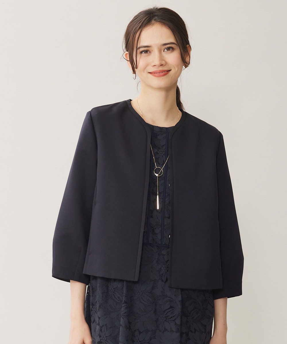 下画像は、「東京ソワール/Apploberry」ふくれジャカードのゲストドレスです(ドレス丈9号で115.0㎝です)。肘が隠れる袖丈で一枚でもお召し頂けますが、下画像のジャケットを合わせてお召し頂くとよりフォーマルな装いになります。![]()