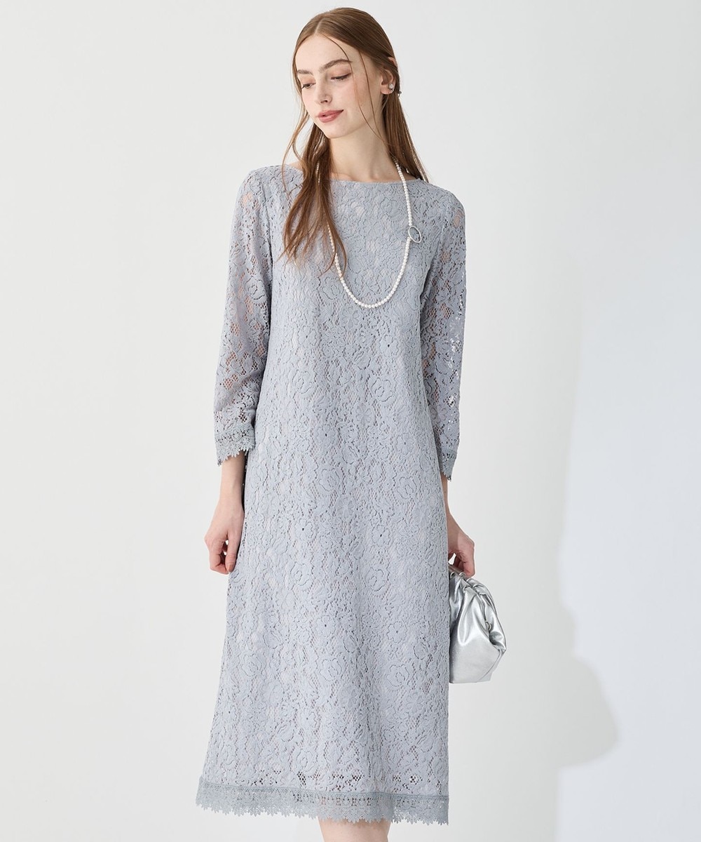 下画像は、「BLUEEAST (ブルーイースト)」バックリボンレースオケージョンドレス ブルーグレー/M(こちらはレンタル商品です)。ドレス丈123.0㎝です