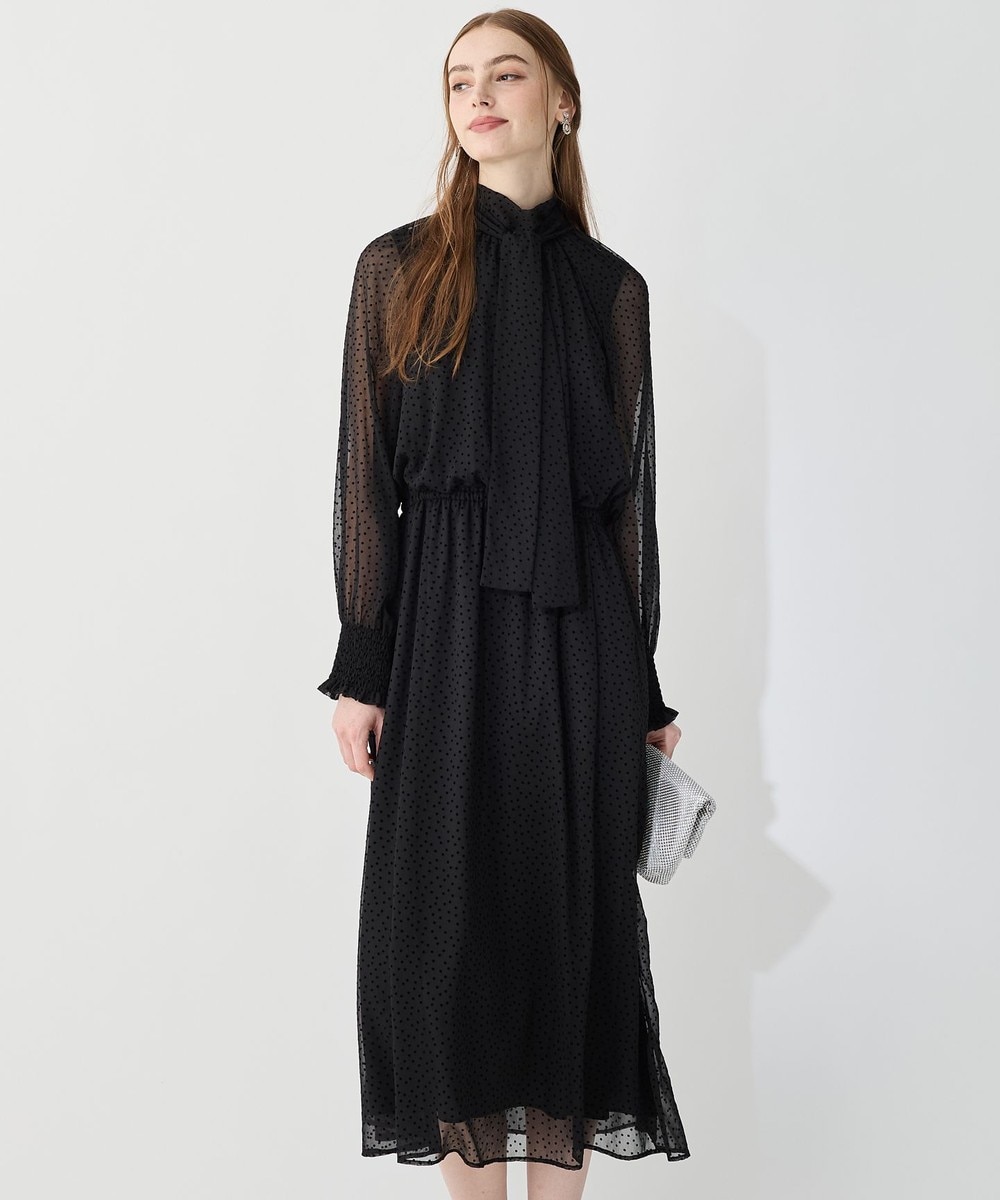 下画像は、柔らかく透け感のある素材と流れるようなシルエットが魅力の「23区」【APPLAUDIR】シアードットフロッキー ボウタイリボンドレスです。ドレス丈38/Mサイズ相当で118.0㎝です