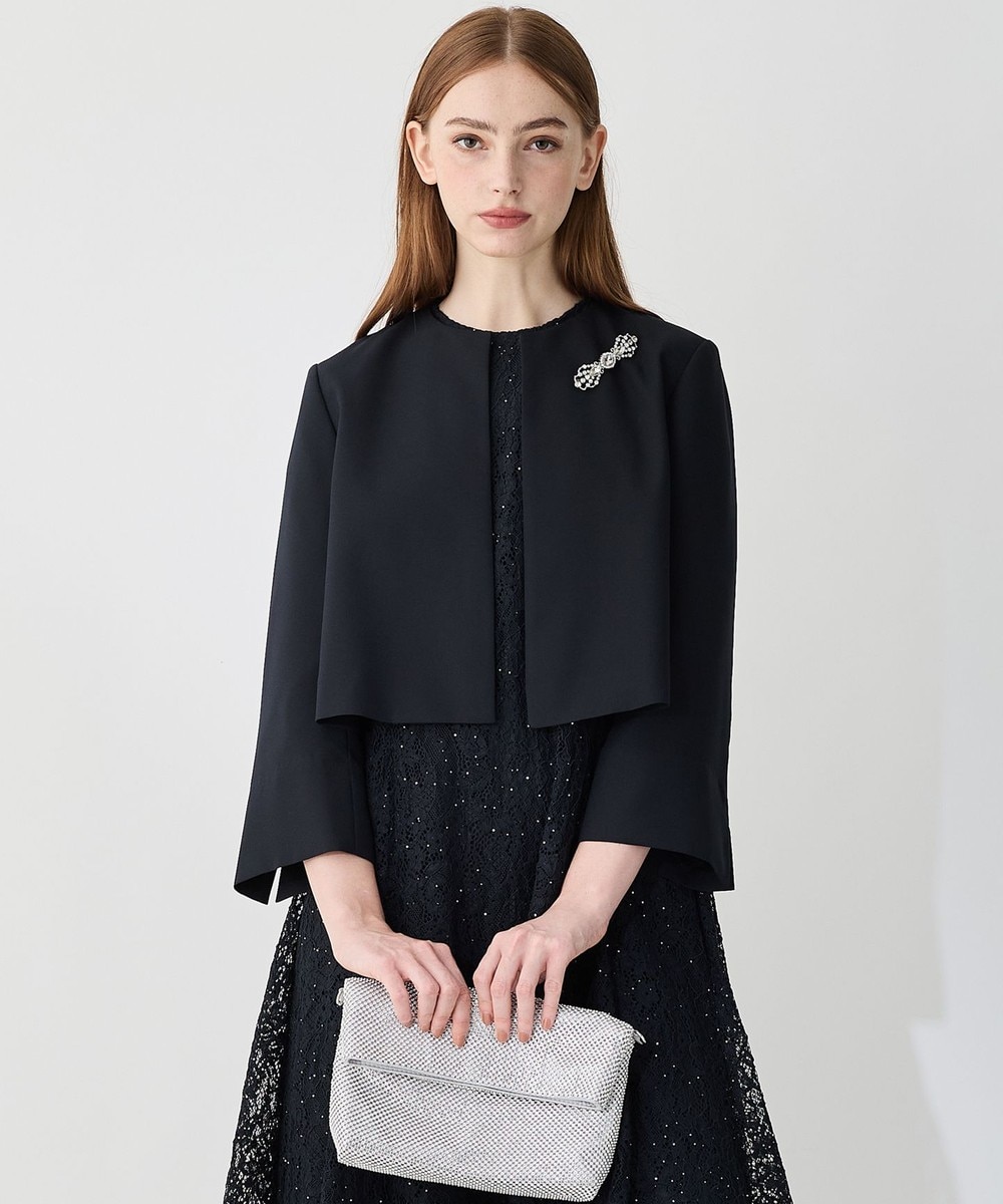 上画像のドレスも長袖ですので、1枚でもお召し頂けますが下画像の「23区」【APPLAUDIR】スパングル コンパクトカーディガンを羽織って頂きますとより安心です。