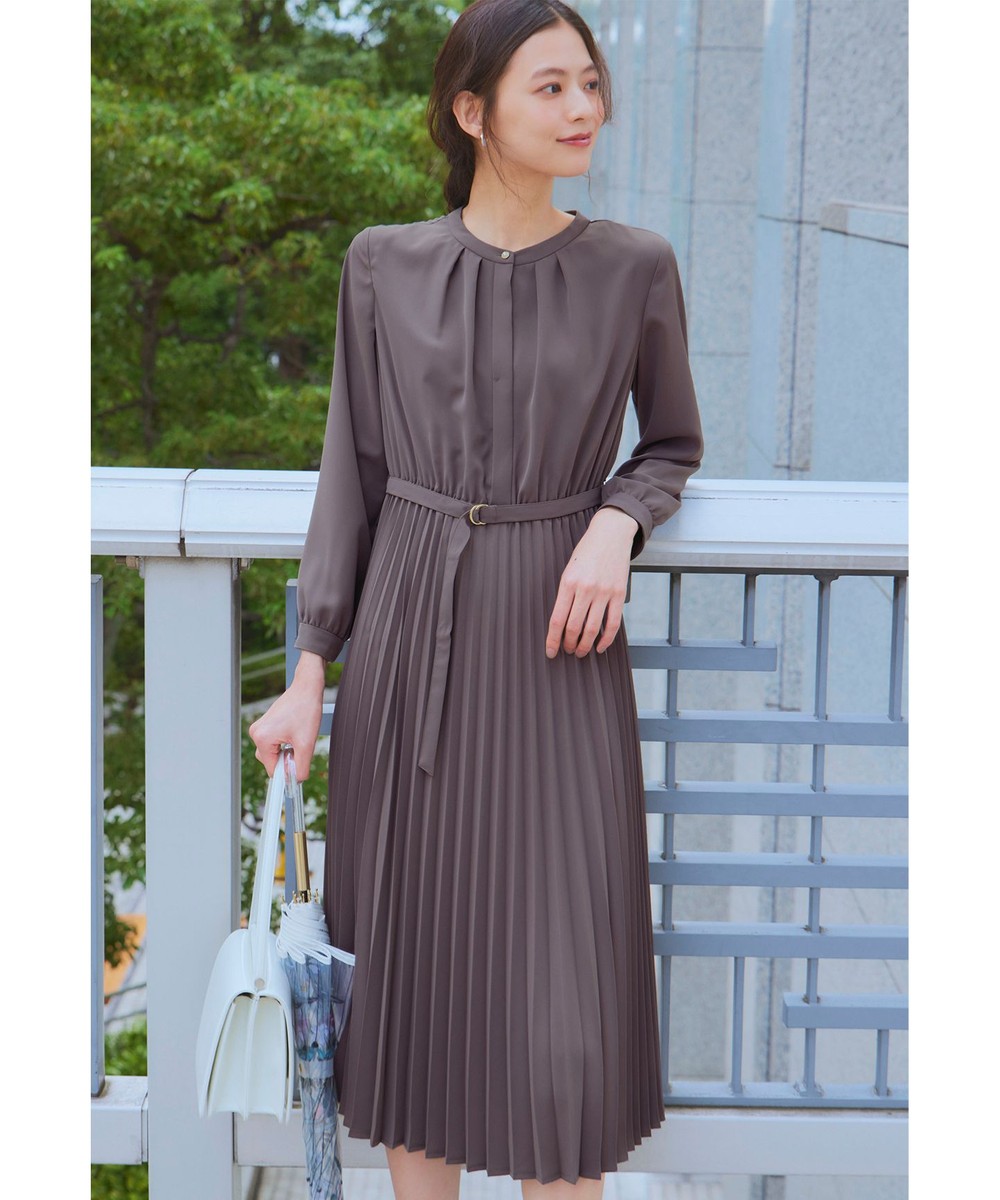 下画像は、プリーツデザインが上品な「any SiS」【洗える】スタンドカラープリーツ ワンピースです。ドレス丈02/Mサイズ相当で115.5㎝です