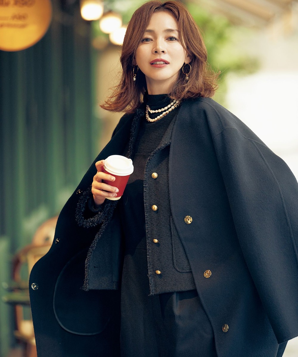 下画像は、オンオフ活躍する「自由区」【SHIHOさん着用】ブライトリングツイード ジャケットです。下画像のワンピースとコーディネートしたり、ブラウス+スカートとコーディネートしたりして頂けます。
