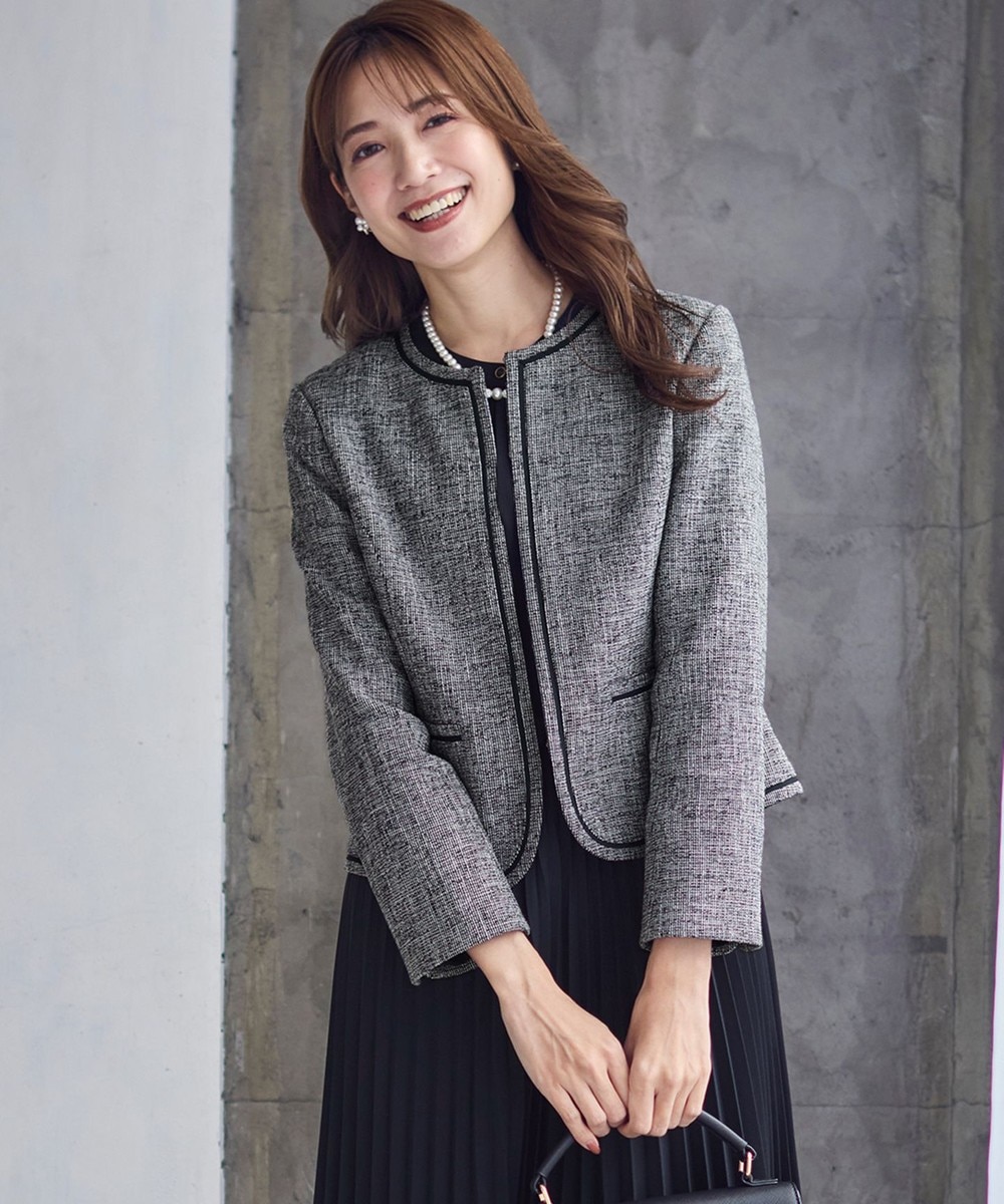下画像は、「リフレクト」【フォーマル/入卒/ママスーツ/セットアップ可】ツイードジャケットです(05号(SS)サイズ~17号(4L)サイズまで展開しています)。上画像のワンピースと合わせて卒業式にお召しいただけます。