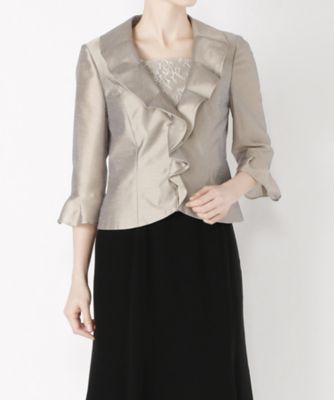 衿元から前端、袖口にあしらったフリルがフェミニンなジャケットです。(こちらはレンタル商品です)