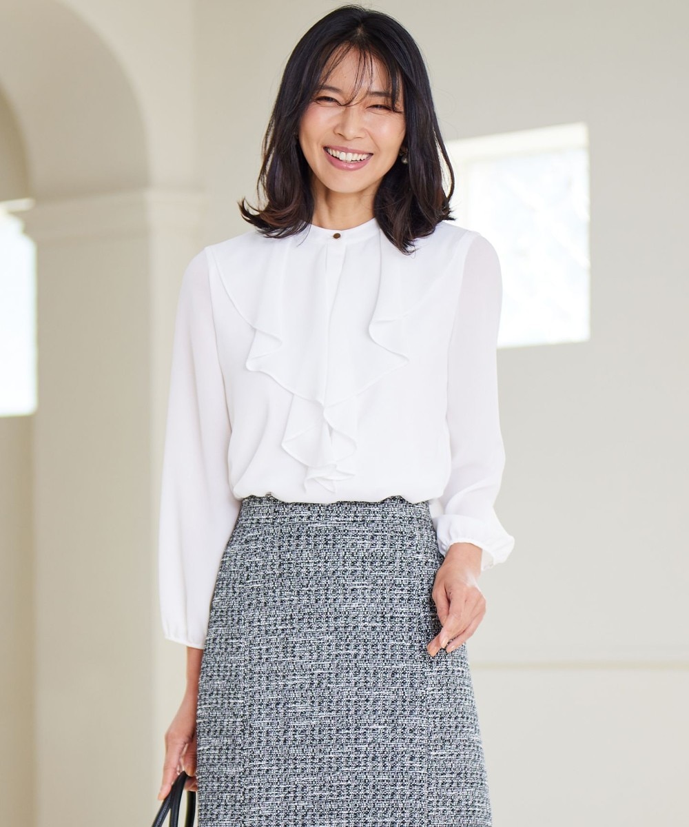 下画像は、大きくしなやかなフレアのフリルが上品な「23区」【洗える】ジョーゼットフリル ブラウスです。上画像のジャケット、パンツとコーディネートしていただけます。