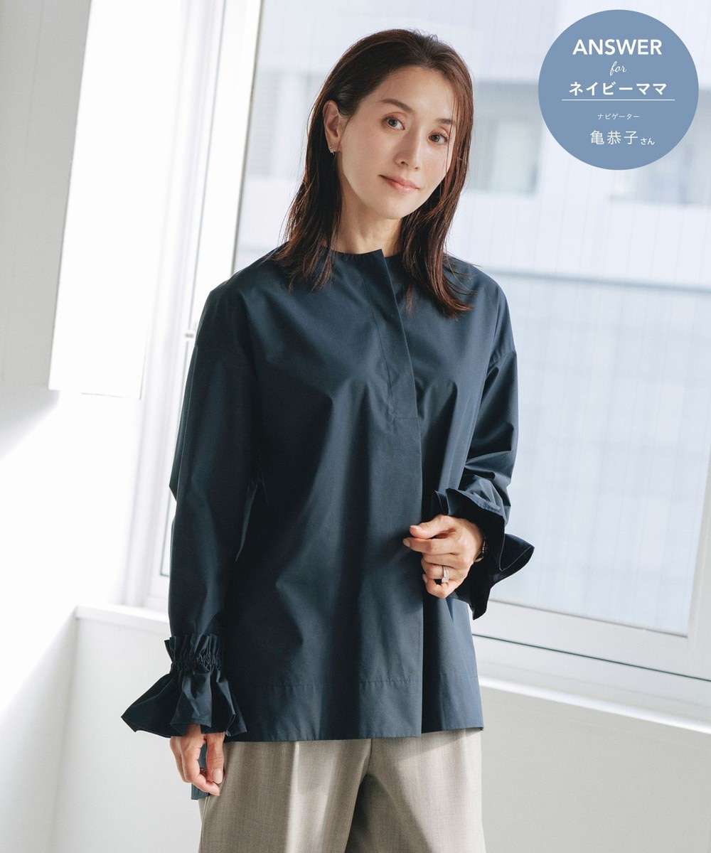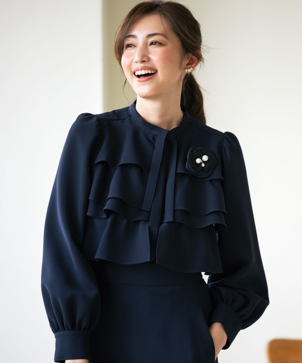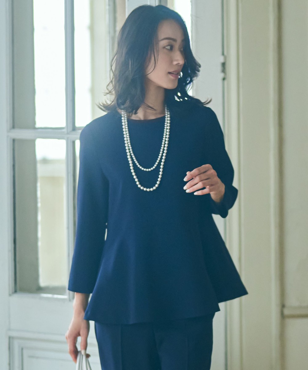 下画像は、「組曲」【NAVY】コンフォータブルドレープ ティアードブラウスです。上画像のジャケット・パンツとセットでお召しいただけます。