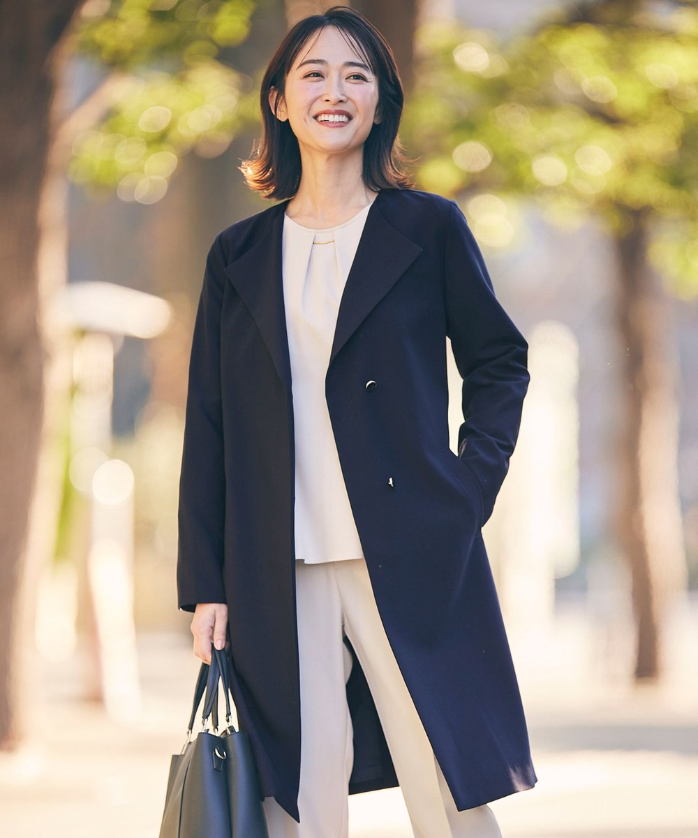 下画像は、「組曲」【NAVY】ダブルクロスストレッチノーカラーコートです。ジャケットのような見え感ですので、室内でも脱がずにそのままお召しいただけます。