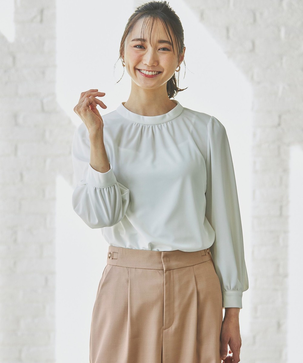下画像は、「any SiS」【UVケア】イージーケアスタンドネック ブラウスです。上画像のジャケット・ワイドパンツとコーディネートして頂けます。