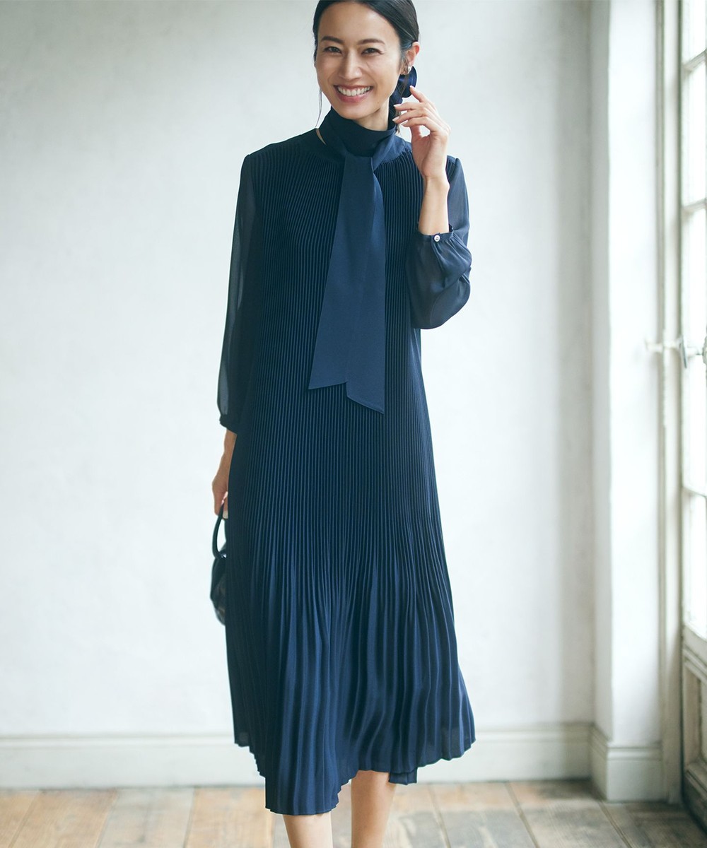 下画像は、リボンで表情を変えてお召しいただける「23区」【VERYコラボ】シャイニーアムンゼン プリーツ ワンピースです。