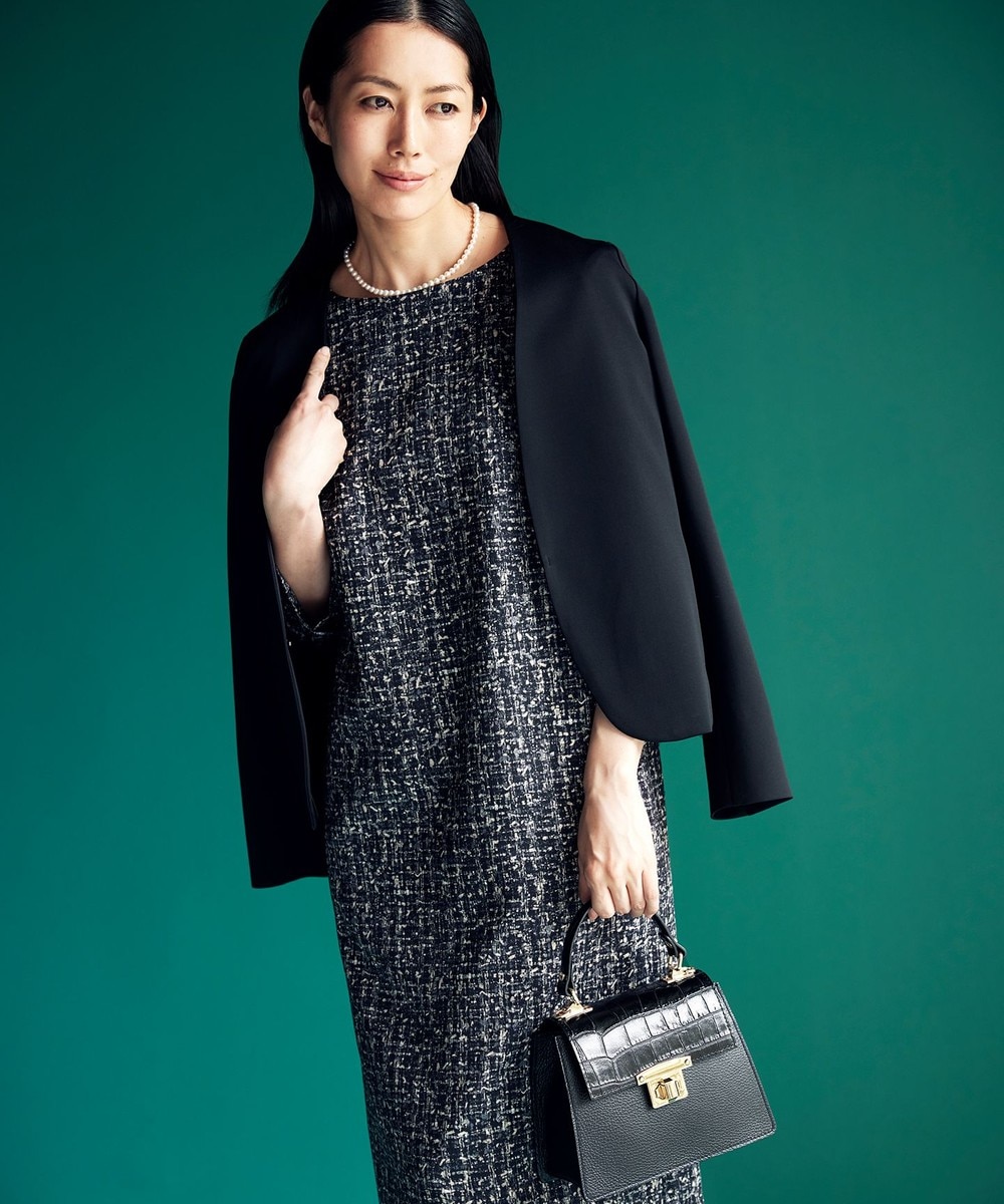 下画像は、ツイード調の柄をプリントしたIラインシルエットがオシャレな【カタログ掲載・洗える】プリントジャガードストレッチ ワンピースです(ワンピース丈38/Mサイズ相当で104.5㎝です)。上画像のモクロディ ノーカラージャケットとコーディネートしていただけます。
