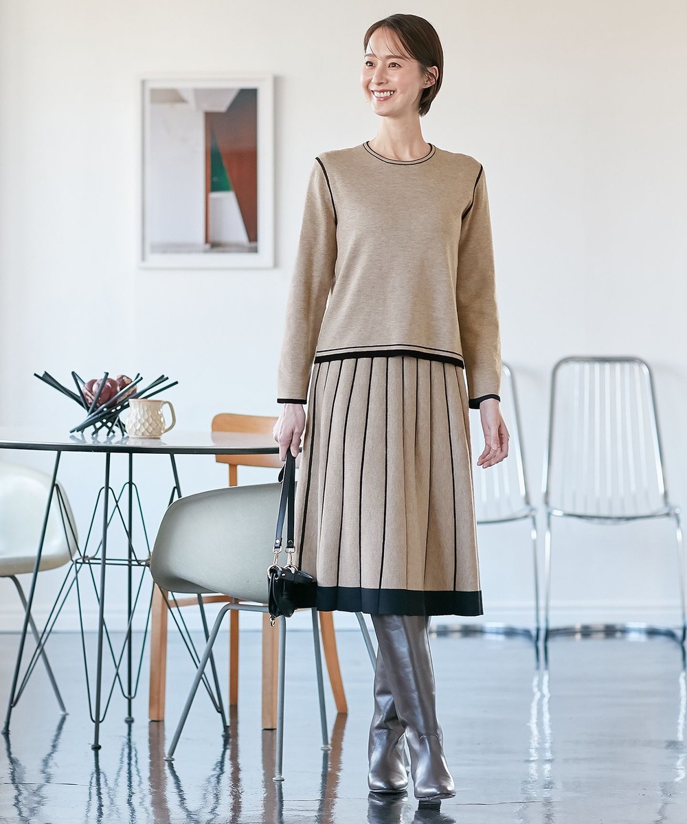 下画像は、すっきりした見頃と裾に向かって程よくフレアなシルエットが大人っぽい「自由区」【セットアップ対応・洗える】モクロディ ワンピースです。上画像のジャケットとセットでお召しいただけます(ワンピース丈38/Mサイズ相当で111.5㎝です)。