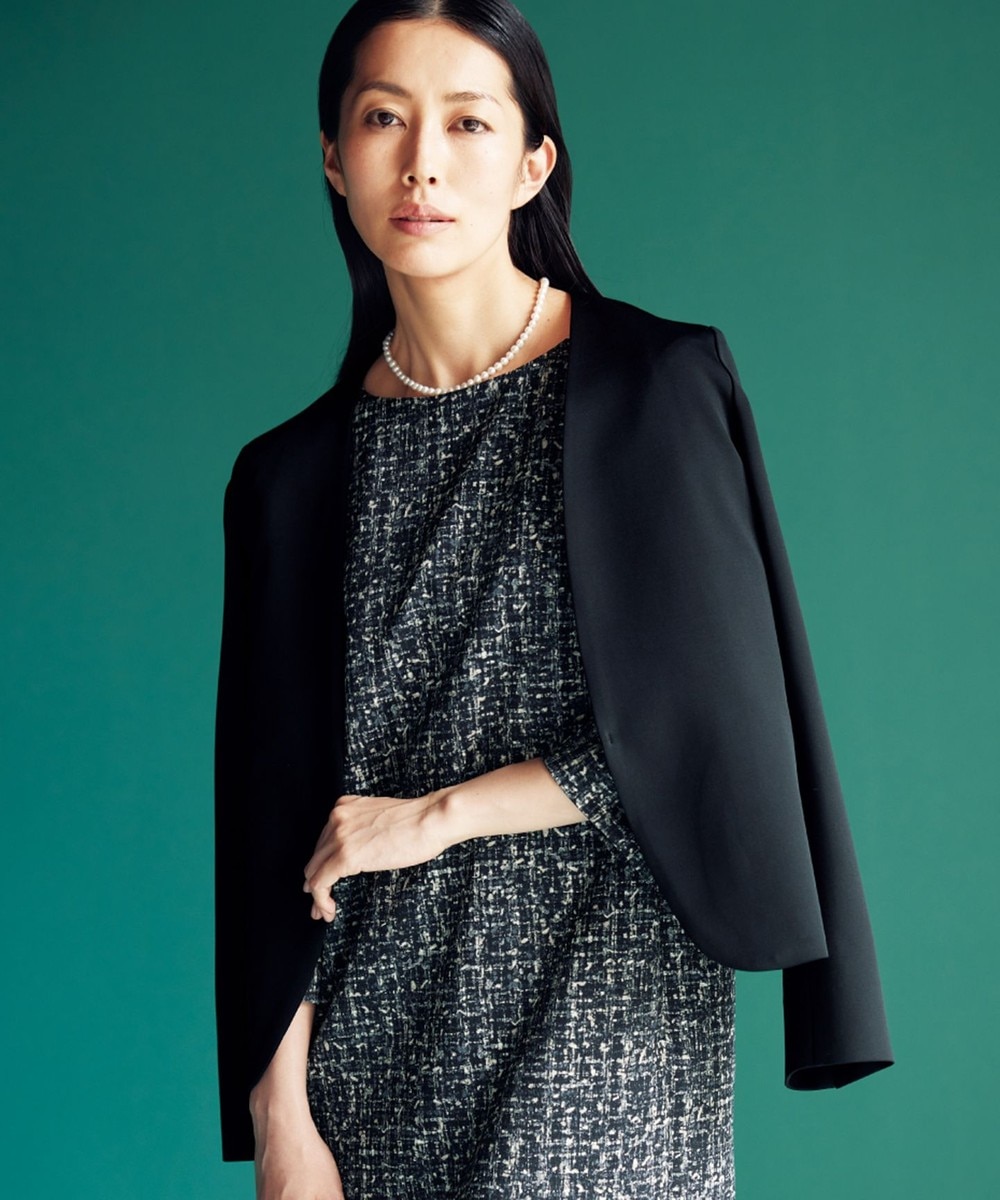 下画像は、ボレロ感覚でお召しいただける「自由区」【カタログ掲載・セットアップ対応・洗える】モクロディ ノーカラージャケットです。上画像の「ニットセットアップ」や下画像の「ストレッチツイードプリントワンピース」とコーディネートしたり、下画像の「モクロディワンピース」とセットでお召し頂いたりできます。