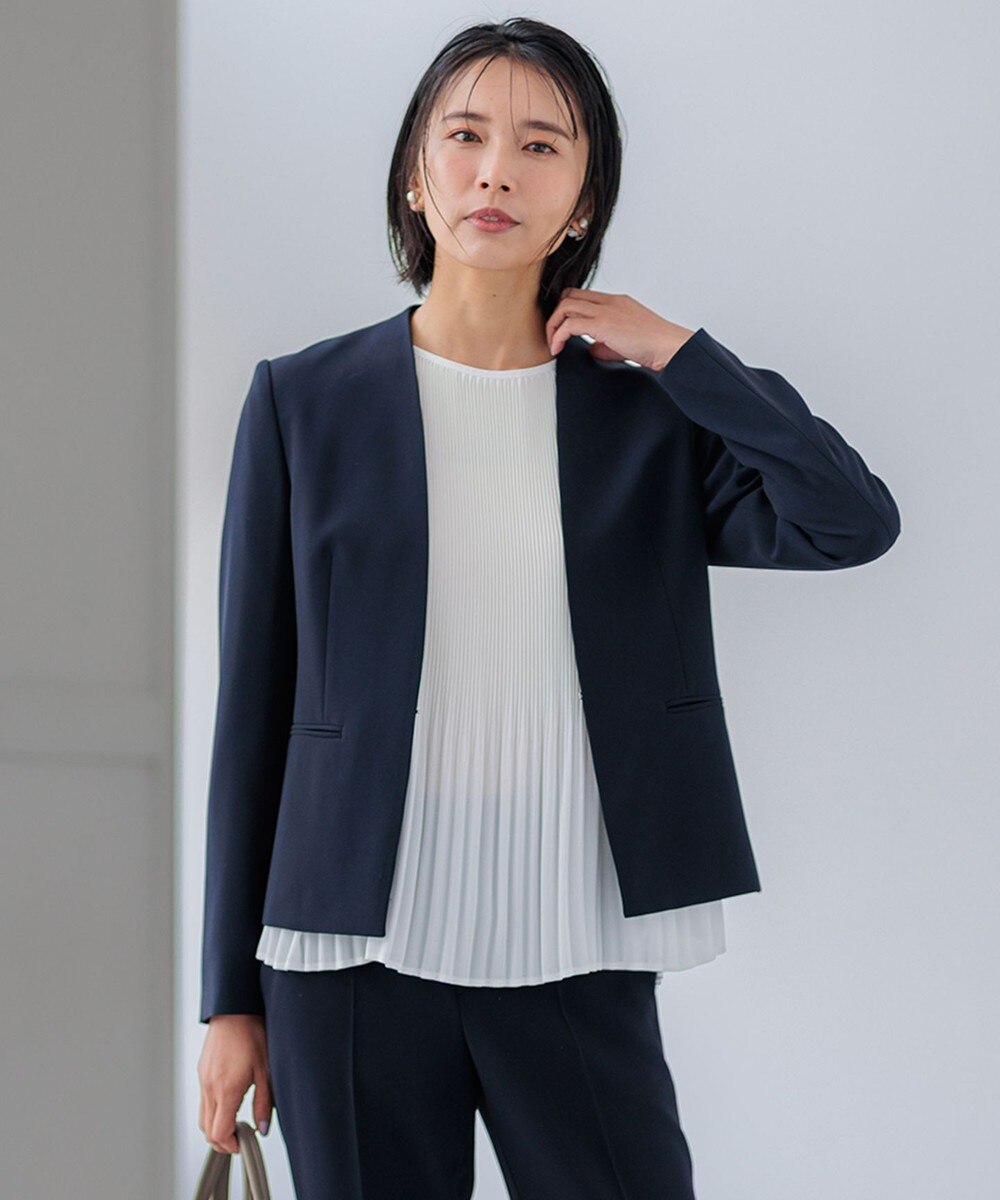 下画像は、どんなシーンにもお使いいただける「23区」【一部再予約/セットアップ対応】トリアセダブルジョーゼット ノーカラー ジャケットです(大きいサイズは44/XLサイズ相当~50/XXXL~サイズ相当までサイズ展開をしております)。下画像のパンツ・スカートとセットでお召しいただけます。
