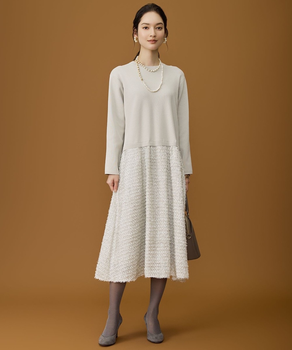 下画像は、エレガントな雰囲気の素材感が魅力のAラインシルエットドレス「23区」【APPLAUDIR】フラワージャカード ドレスです(12月10日現在でライトグレー40/Lサイズ相当在庫なしです)。ドレス丈38/Mサイズ相当で110.0㎝です。