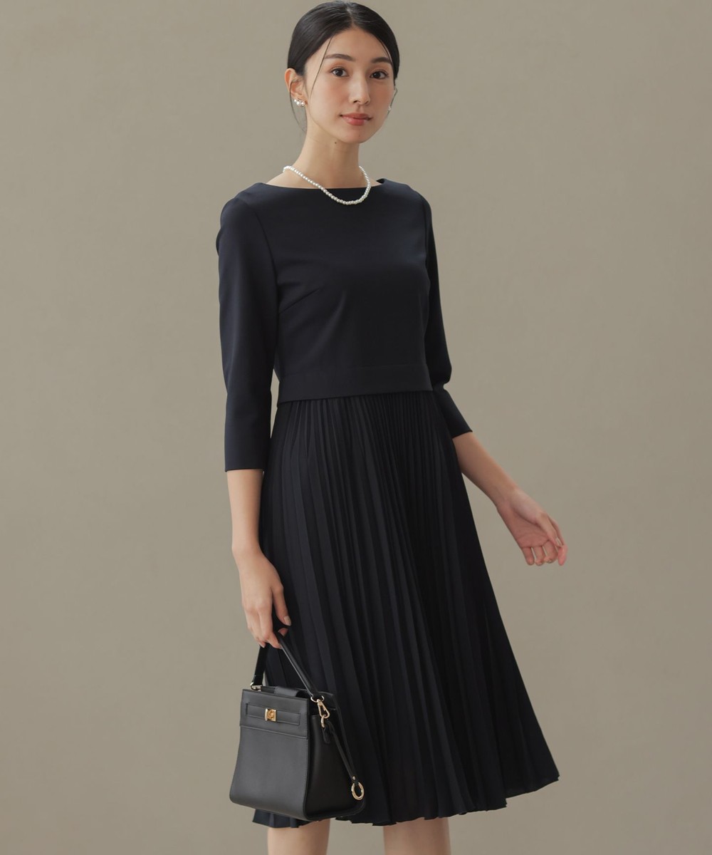 下画像は、タイムレスに愛される、組曲のベストセラーワンピース、「組曲」【KUMIKYOKU NAVY】ジャージーコンビプリーツ ワンピースです。ワンピース丈2/Mサイズ相当で105.0㎝です。
