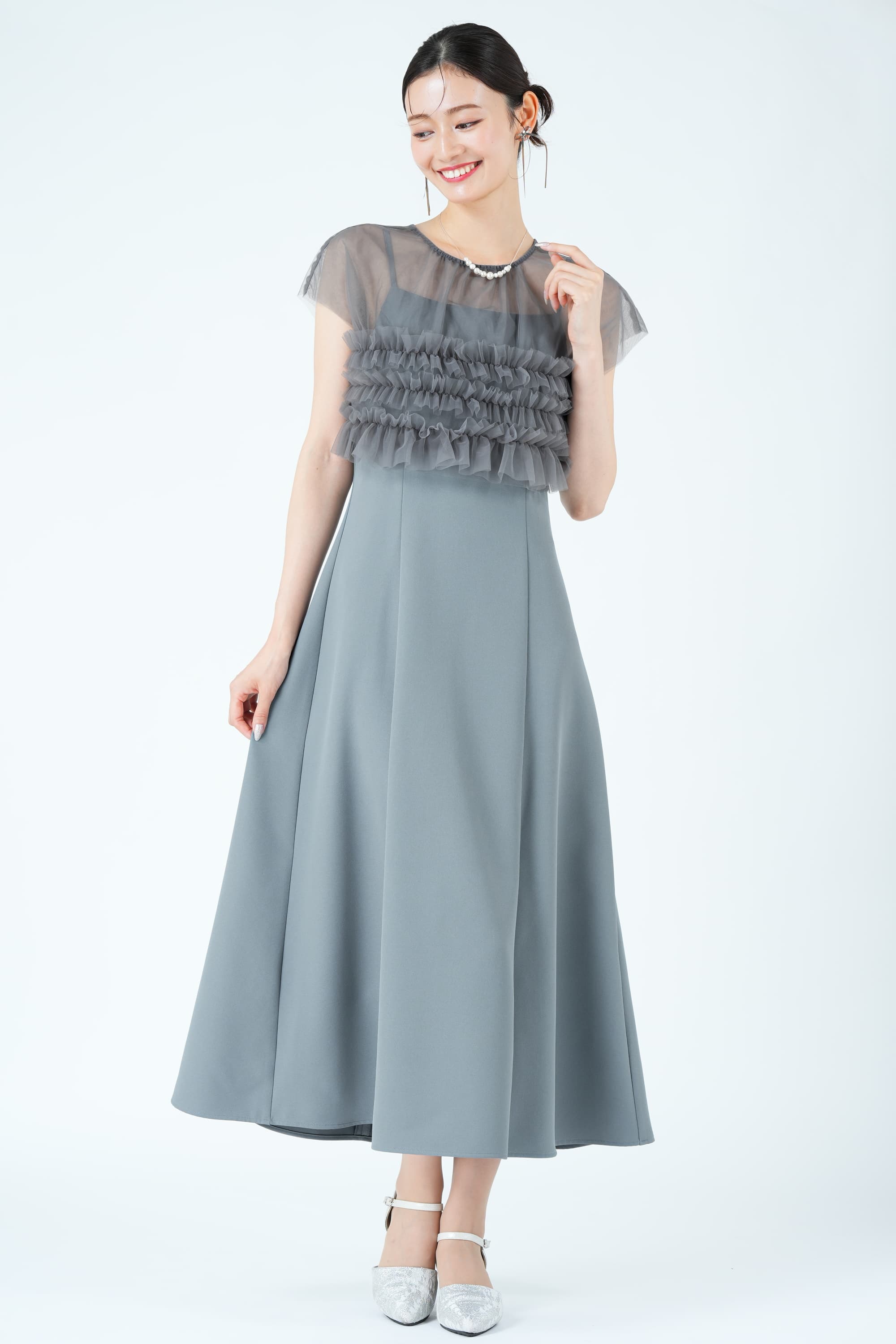 裾までのロングドレスに抵抗のある方も、ディナーショーではドレス丈120㎝前後のミモレ丈ですとお召しいただきやすいです。