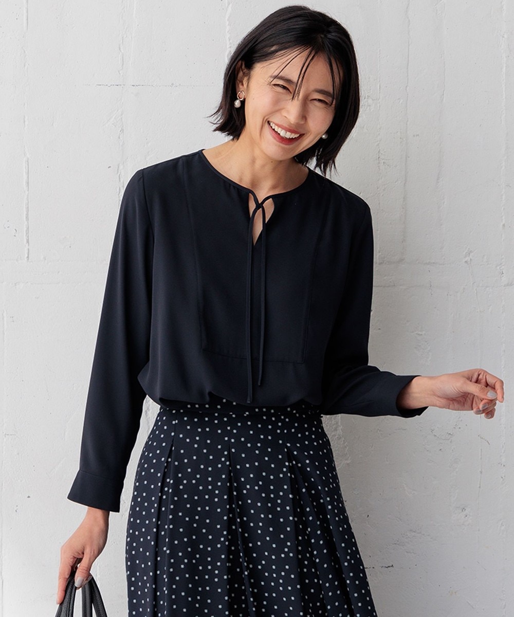 下画像は、「23区」【洗える】バックサテンアムンゼン ブザムディテール ブラウスです。繊細な細番糸で織った「23区オリジナル」のバックサテンアムンゼンブラウスで、上画像のリネンブラウスよりエレガントになります。