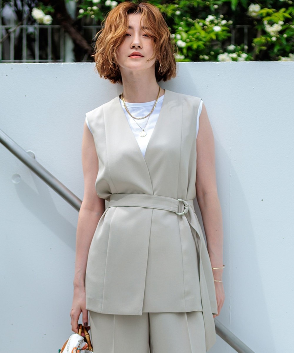 下画像は、「23区」【先行予約/撥水加工】キューティクルストレッチツイル ジレです。上画像のパンツと合わせて、同窓会や食事会などにもお勧めです。
