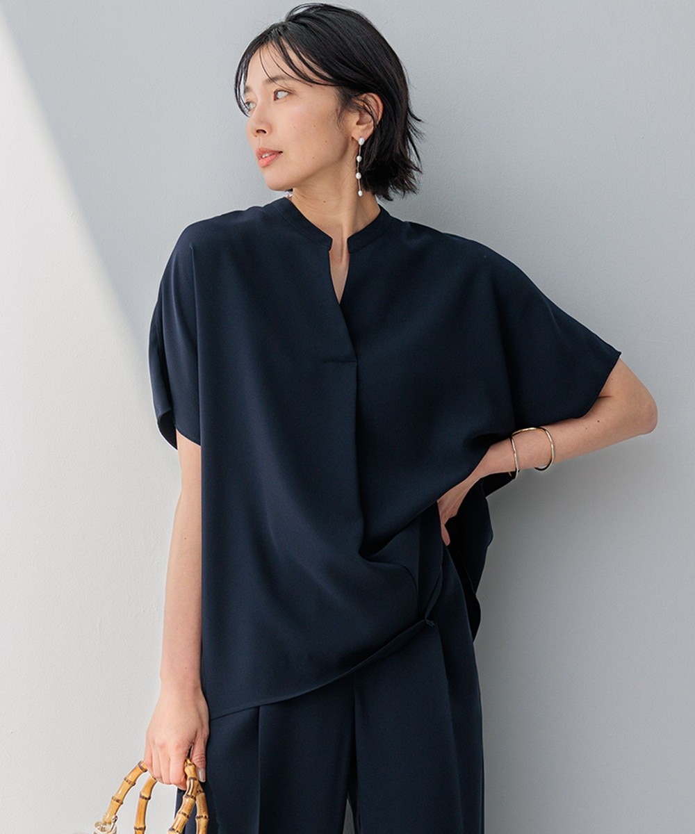 下画像は、スッキリとしたキーネックに、深いタック使いが涼やかな印象の「23区」【洗える】ストレッチジョーゼット フレンチスリーブ カットソーです。