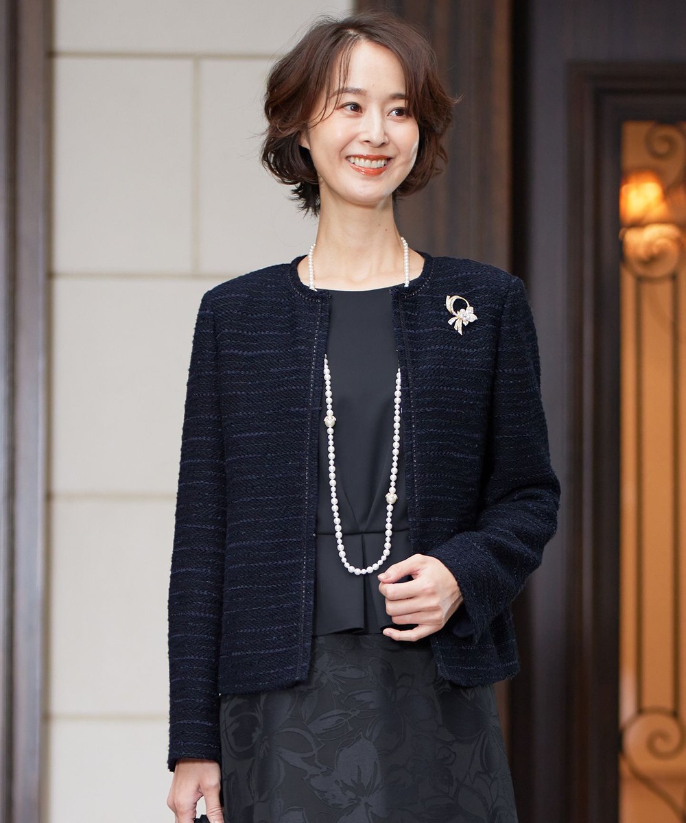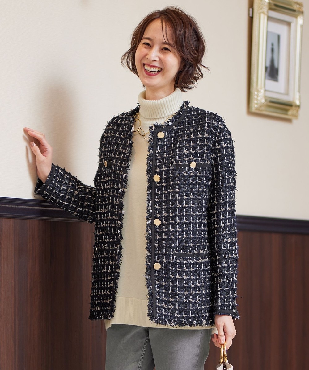 下画像は、フォーマルシーンに頼れる「自由区」ファンシーツイード ジャケットです。上画像の「自由区」リバーシブルニットセットと合わせてお孫さんの卒園式にお召しいただけます。