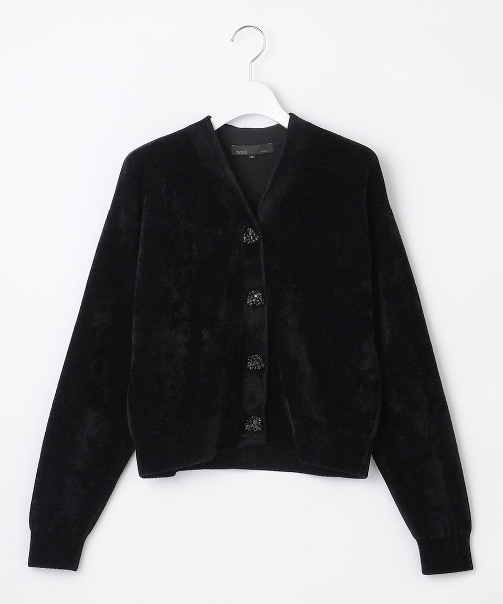 下画像は、光沢のあるモール素材とビジュー刺繍がフェミニンな「自由区」【Premium Collection】キュプラシェニール カーディガンです。ニットセットは単独でもお召しいただけますが、ジャケットのように見えて着心地のよいカーディガンを合わせていただくとよりきちんと感が出ます。