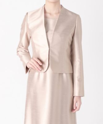 下画像は、「東京ソワール ドルチェ」のノーカラージャケットです。光沢のあるシャンタン素材が美しい、シンプルなジャケットです。