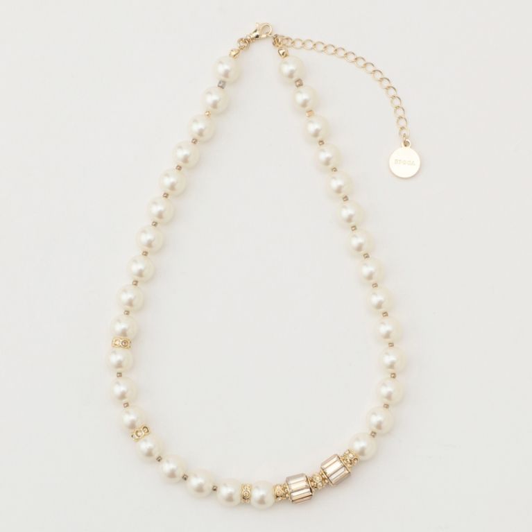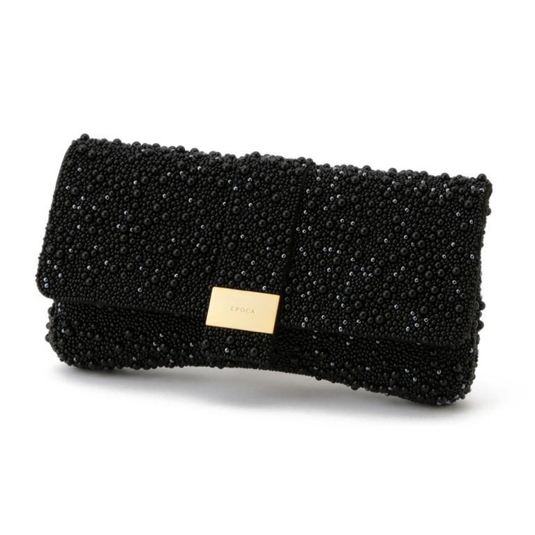 下画像は、「エポカ」のメタルパーツをコンビネーションさせたモダンなネックレスと、パールビーズがラグジュアリーなクラッチバッグです。
