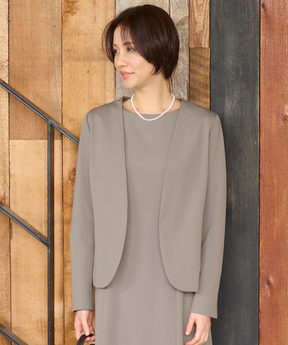 下画像は、シルエットと着心地にこだわった「自由区」【カタログ掲載・セットアップ対応・洗える】モクロディ ノーカラージャケットです。上画像のワンピースと合わせて、ビジネス会食や式典・セレモニーなどにお召しいただけます。