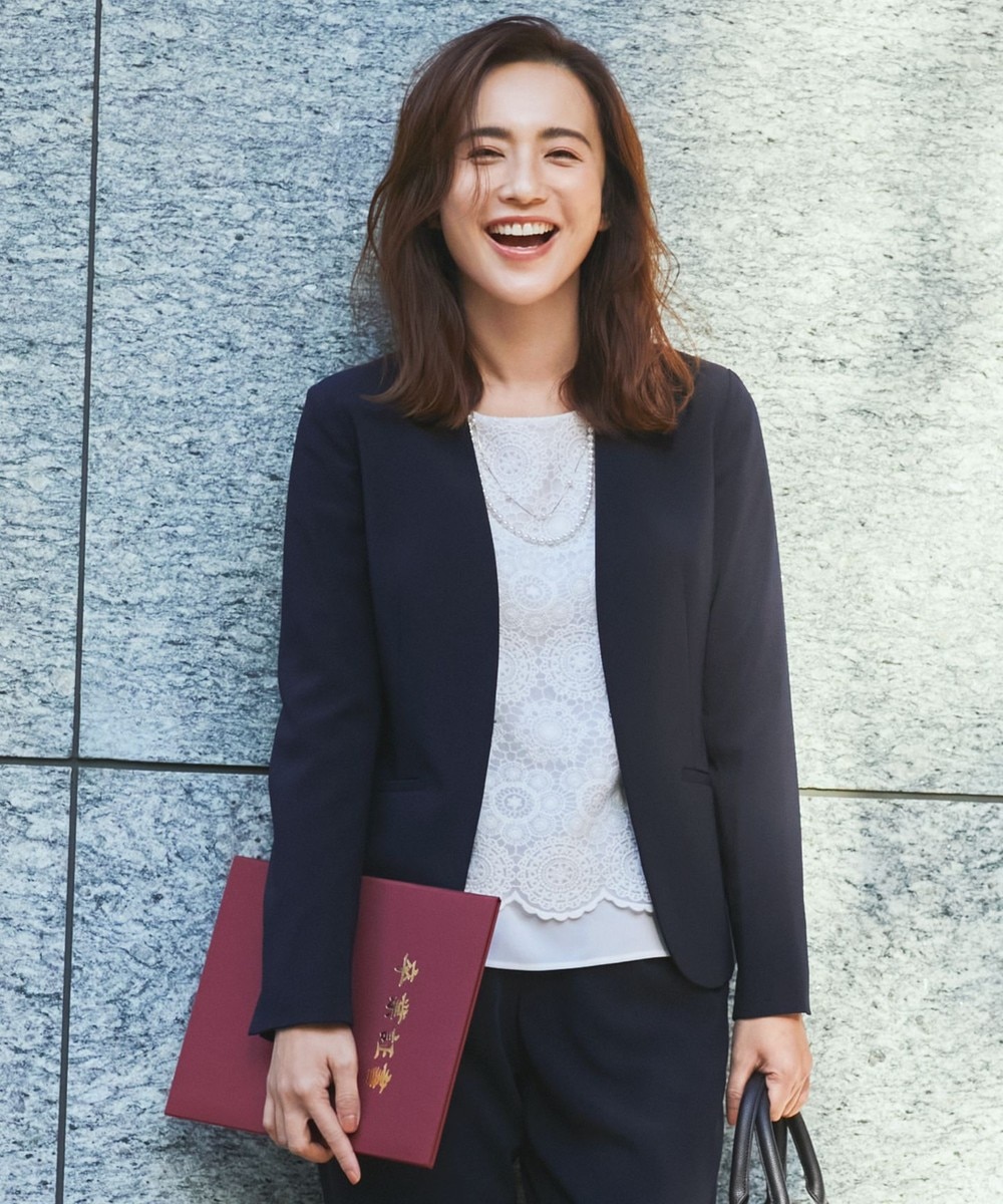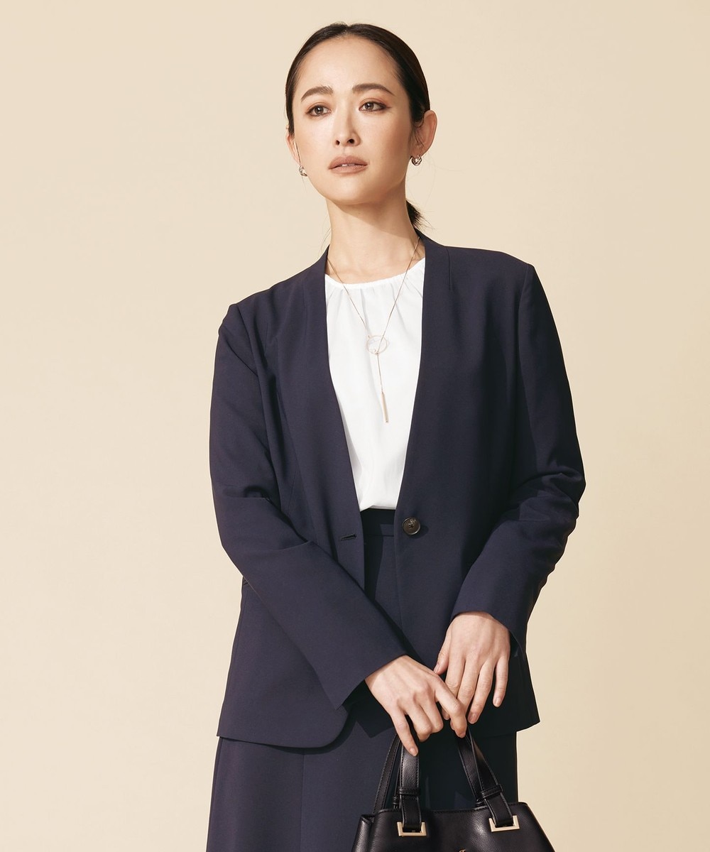 下画像は、通勤やかしこまった場で活躍する「23区」【洗える/セットアップ対応】アイアスマットストレッチ ノーカラー ジャケットです。上画像のパンツとセットでお召しいただけます。