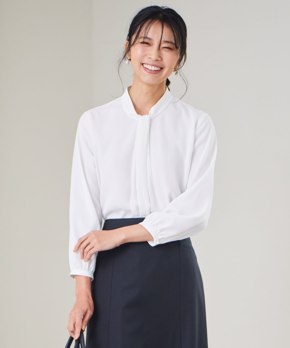 下画像は、「23区」【洗える】バックサテンアムンゼン ボウタイ付き ブラウスです。通勤からフォーマルシーンまで幅広くお召し頂けます。
