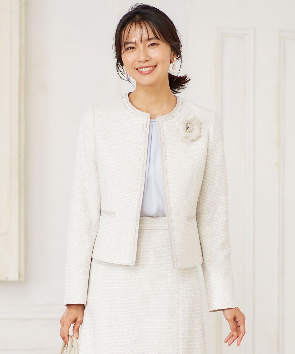 下画像は、華やかなファンシーツイードを使用した「23区」のノーカラージャケットです。同素材のスカートがありますが、単品ジャケットとしてパンツやワンピース・スカートとコーディネートしていただけます。