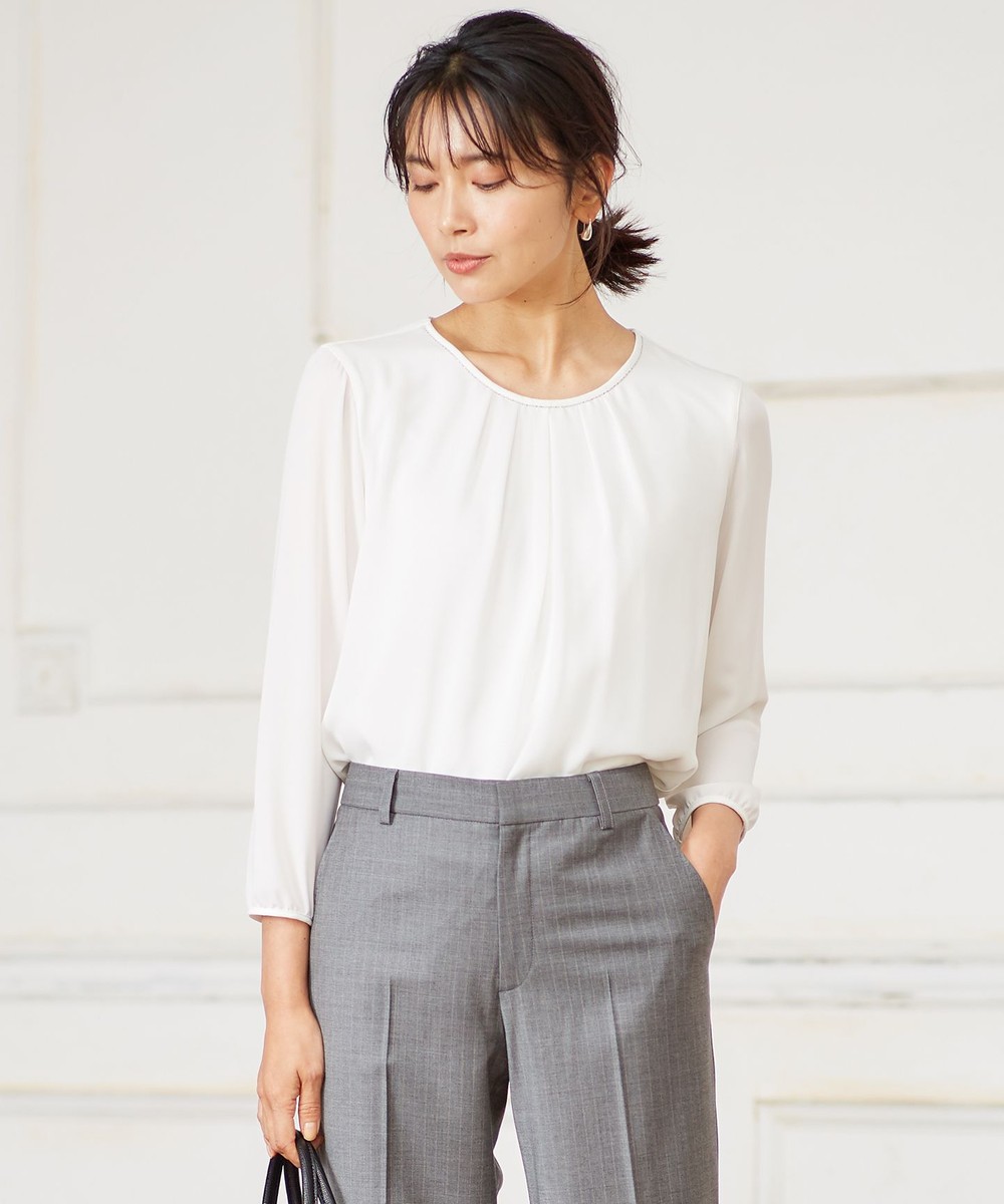 下画像は、首元のボールチェーンとギャザーが上品な「23区」のシルキーデシンカットソーです。上画像のジャケットのインナーとしてお召しいただけます。