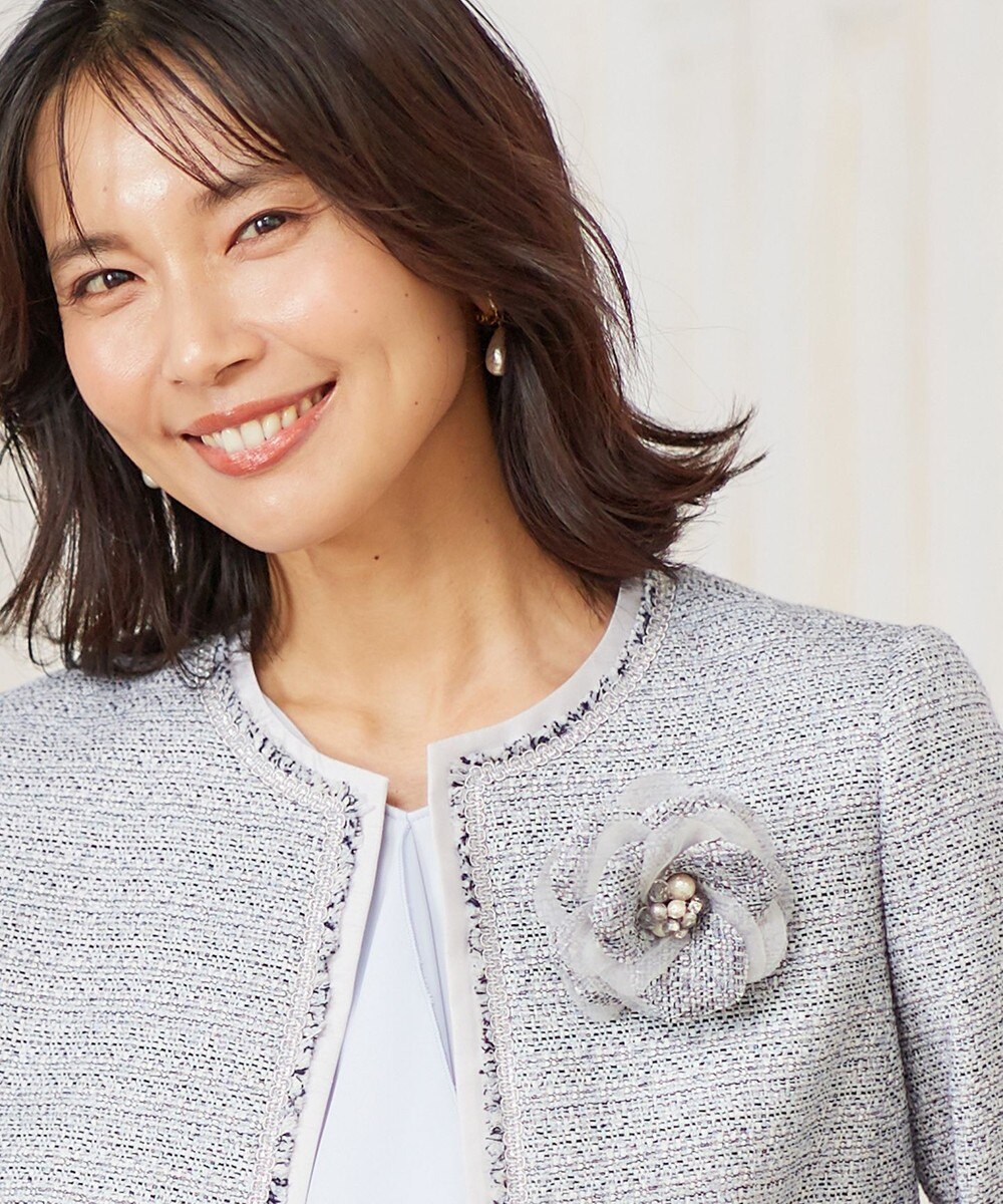 下画像は、上品なラメと意匠糸をふんだんに使用した「23区」のツイードコサージュとバロックのガラスパールを使用した「23区」のネックレスです。