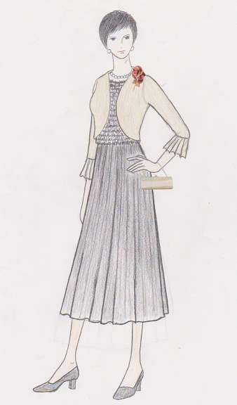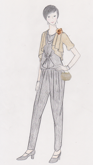 オールインワンタイプ(上下が一続きになった衣服)のパンツドレスはどちらかといえばジャケットを羽織るのではなく、柔らかいボレロやストールを合わせて様になるデザインが多いです(下イラスト参照)。