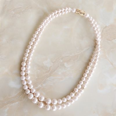 下画像は、顔まわりを華やかに見せてくれる「ニッセン」のパール調2連ネックレスとサテンプリーツとキラキラ光る金具が華やかな「ニッセン」のシェルプリーツサテンパーティーバッグです。