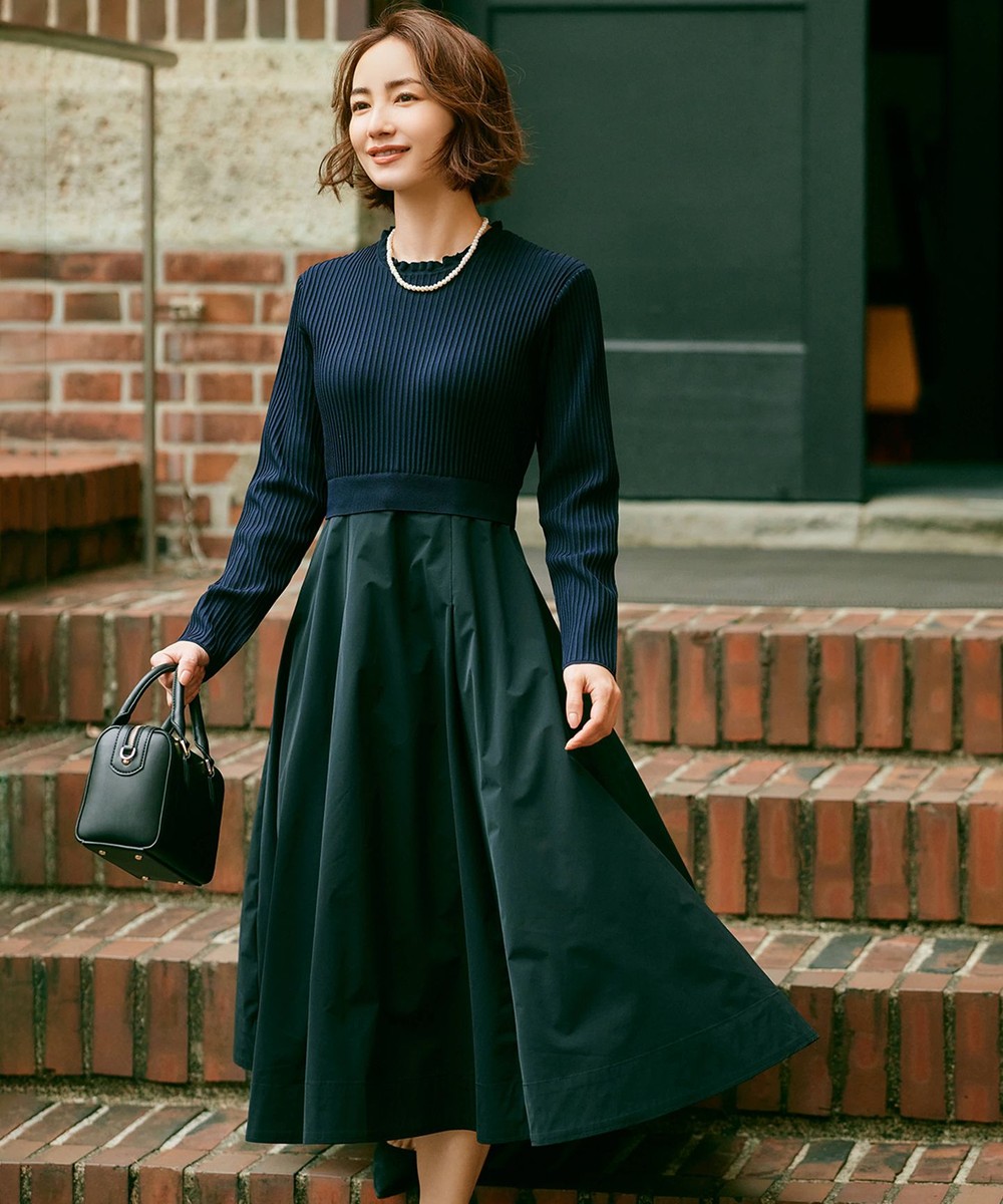 下画像は、「組曲×FLICKA(フリッカ)コラボ」のニットコンビタフタドレスです。上画像のジャケットとセットでお召しいただけます。