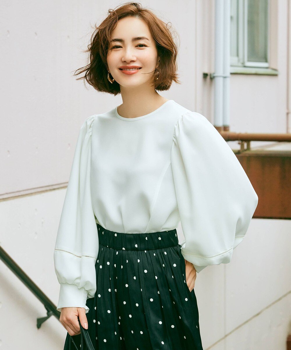 下画像は、「組曲×FLICKA(フリッカ)コラボ」のコンシャススリーブブラウスです。上画像のジャケットのインにお召しいただけます。
