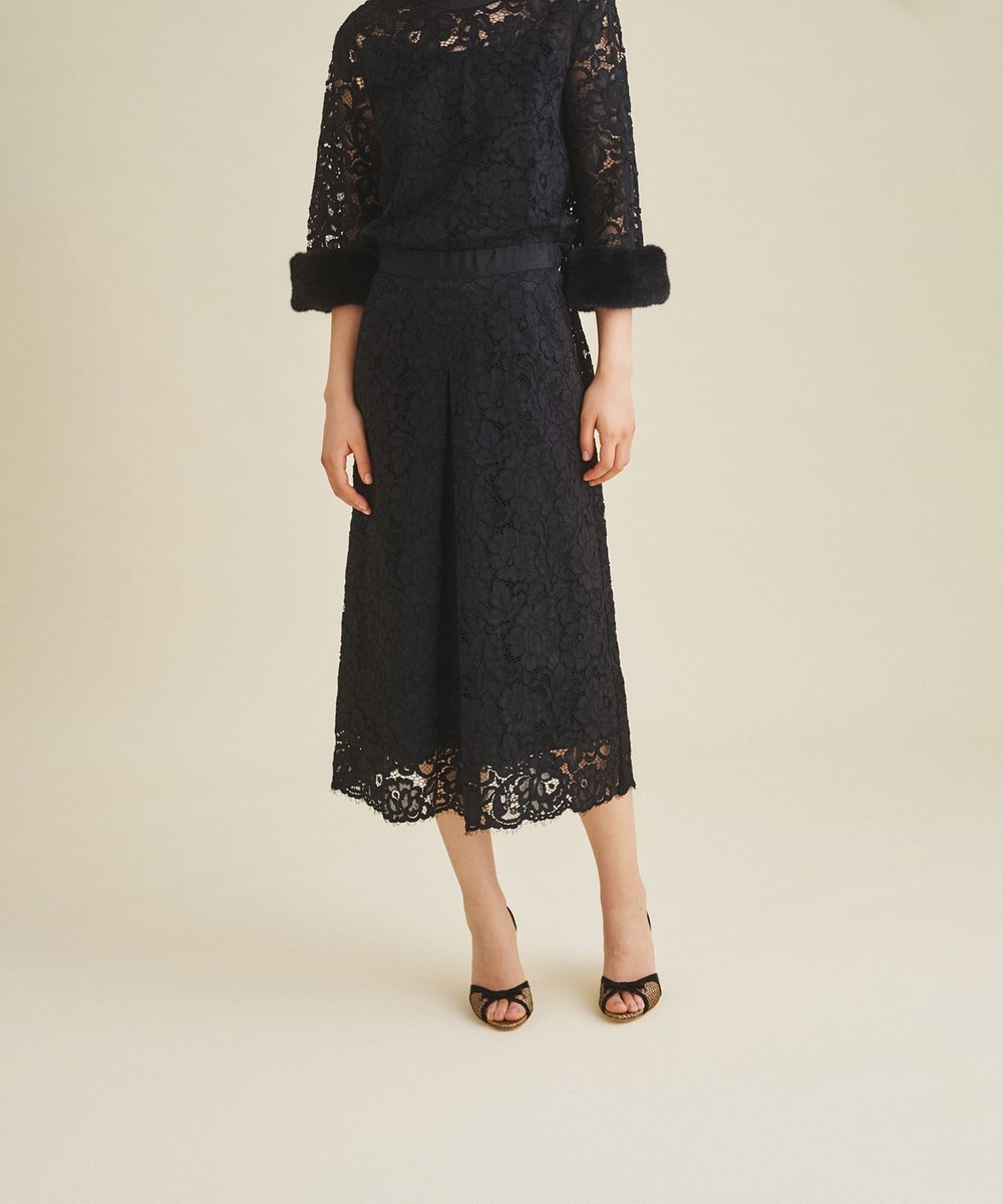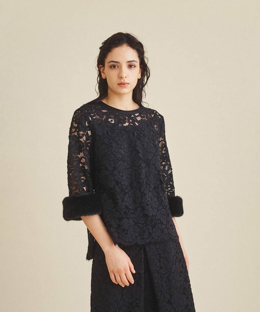 下画像は、「グレースコンチネンタル」のファーカフスレーストップスです。下画像のレーススカートをコーディネートして、ワンピース風にお召しいただくこともできます。