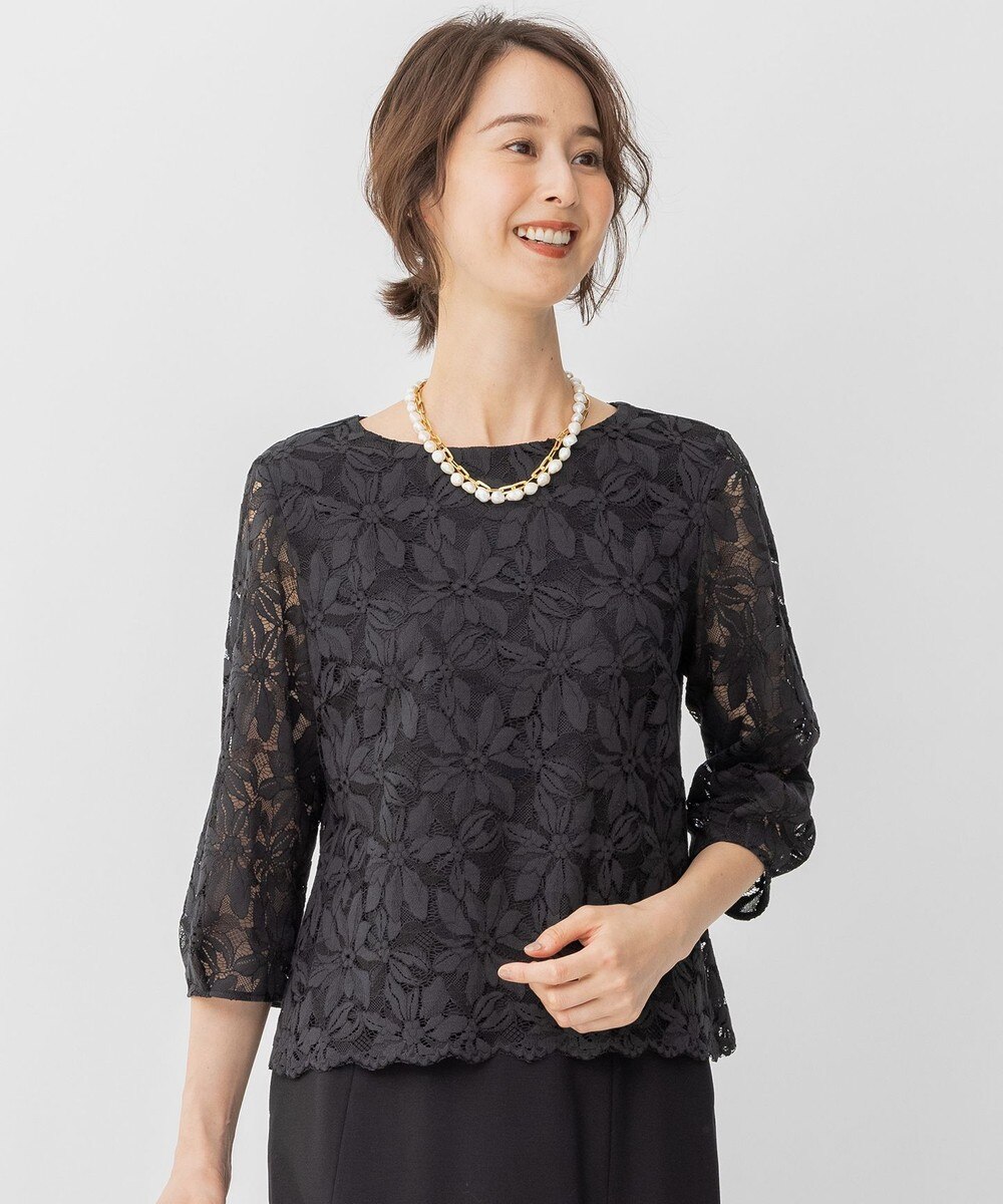 上画像の「グレースコンチネンタル」ファーカフスレーストップスや「自由区」【洗える】フラワーコードレースペプラムブラウスとコーディネートしていただけます。