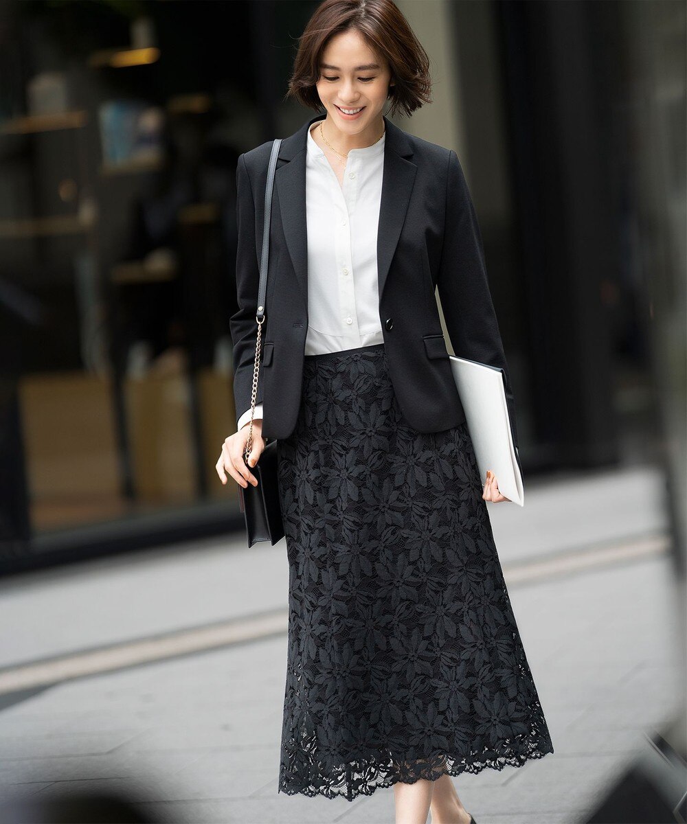 下画像は、「自由区」の【洗える】フラワーコードレースマーメイドスカートです。スカート丈38号で77㎝です。同素材のブラウスはもちろんのこと、カジュアルなトップスをコーディネートしてカジュアルダウンの着こなしもしていただけます。