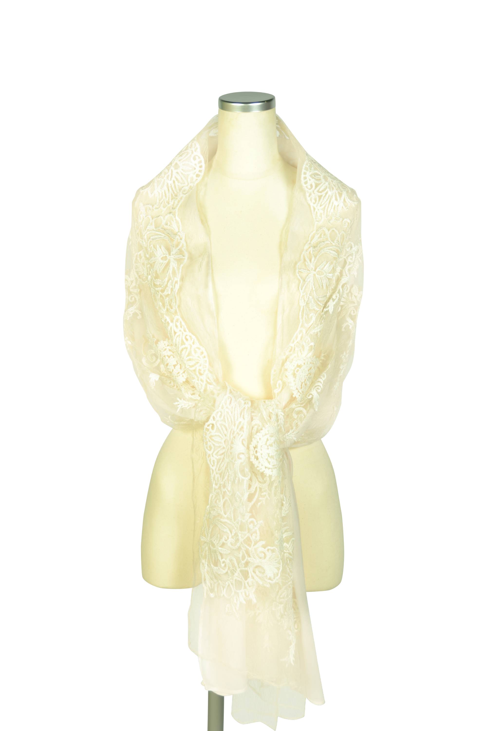 下画像は、「ドリードール」のダマスク柄刺繍ベージュショール(F)と「エルモソ」のスタイリッシュ8分袖アイボリージャケット(S~M)です(ストール・ジャケット共にレンタル商品です)。