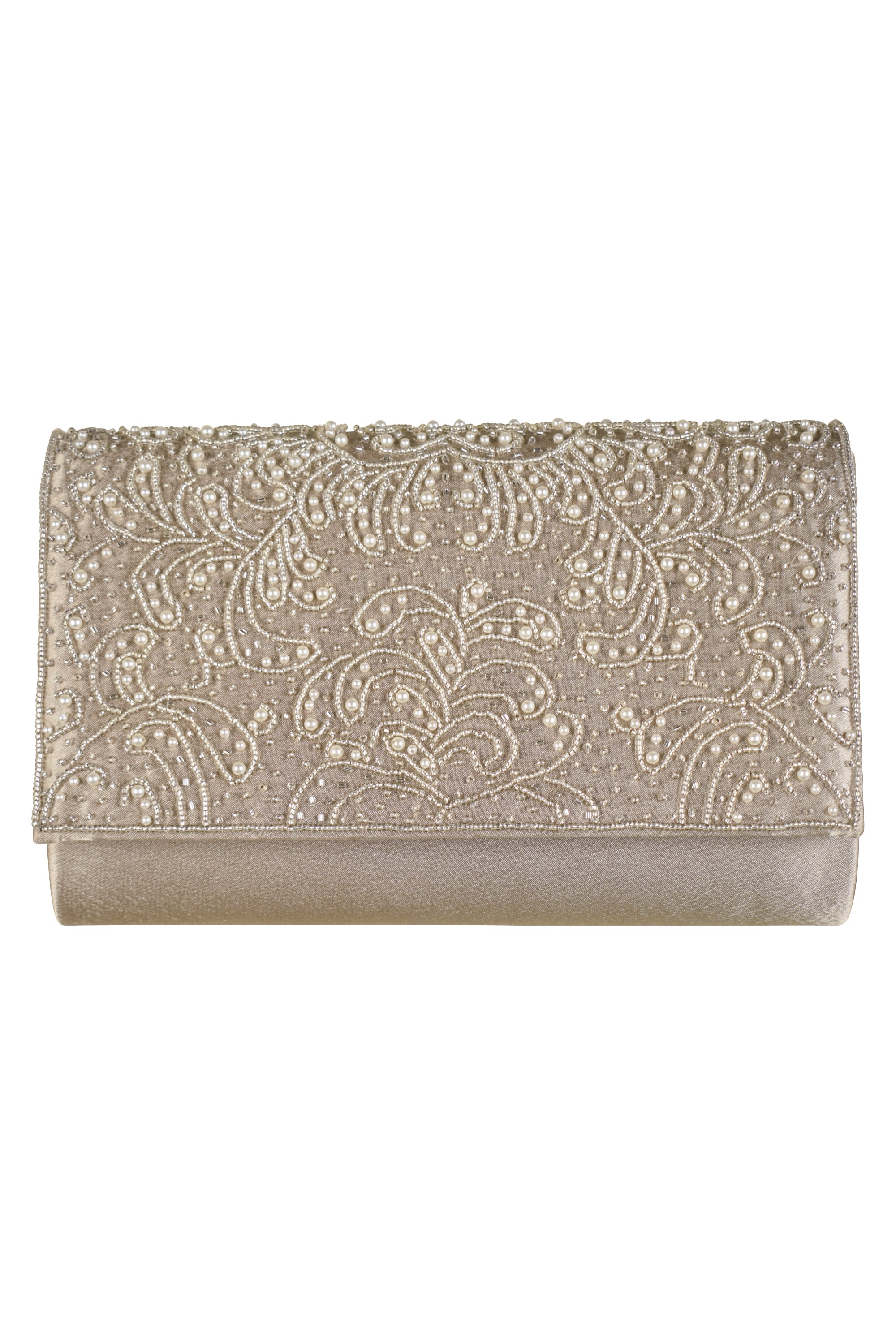 下画像は、「23区」の淡水パールシルバーコンビネックレスとビーズの大きな留め具が華やかな「23区/アプロディール」のギャザービーズクラッチバッグです。