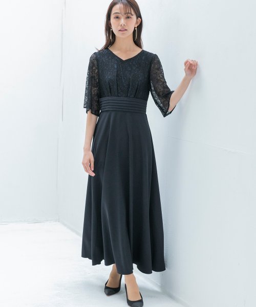 下画像は、トップスのレース素材とスカート部分のシフォン生地がエレガントな「エルモソ リュクス」のレースフレア袖ブラックロングドレス(M)です(こちらはレンタル商品です)。ドレス丈136㎝です