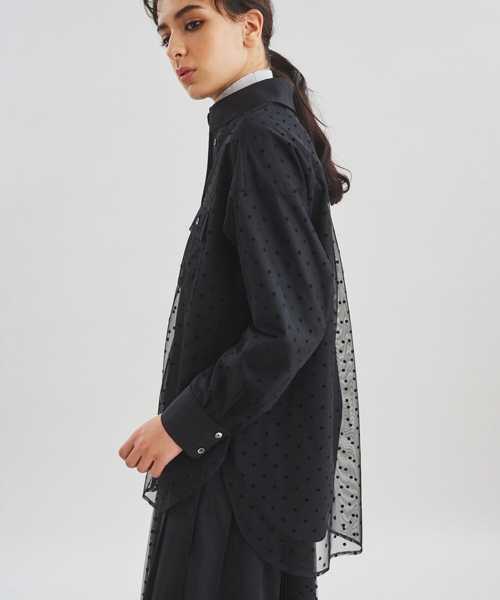 下画像は、シャツ地とチュール地をレーヤードした「グレースコンチネンタル」のチュールレイヤードシャツです。シャツカラーが若干カジュアルではありますが、チュールスカートと合わせると華やかでパーティー仕様になります。